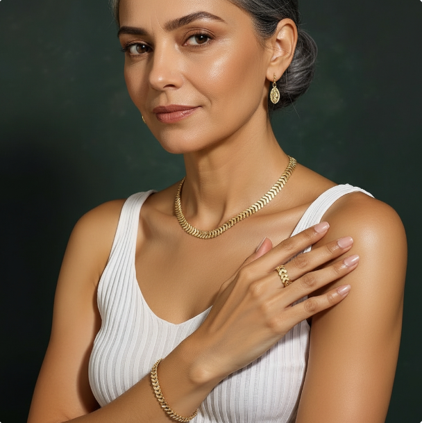 Un ensemble de bijoux harmonieux, conçu pour accompagner chaque femme avec douceur, confiance et raffinement.